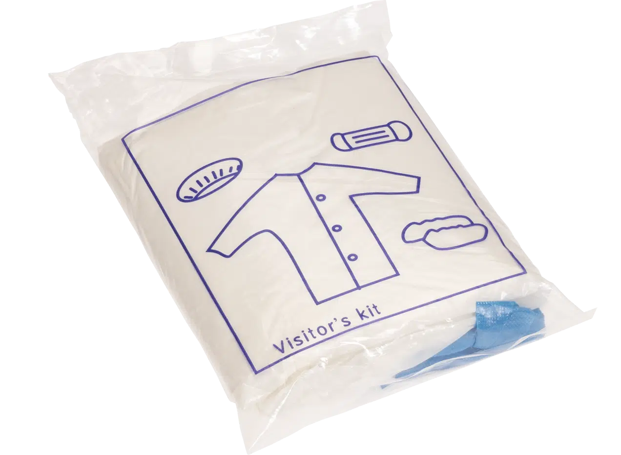 1 blouse PE sans capuche, 1 charlotte ronde, 1 masque papier 1 pli, 1 paire de surchaussures PE